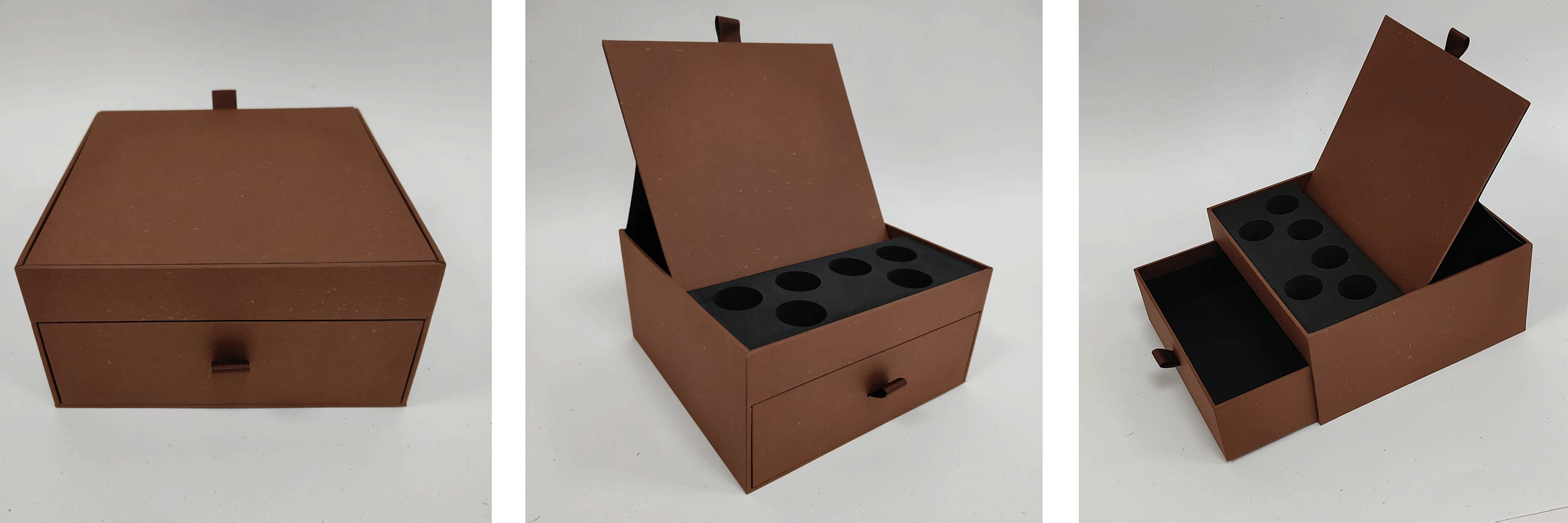 整体为抽屉式盒型,由外盒(主盒体)与内盒(抽屉)组成,采用翻盖+抽屉的双层开启方式,兼具“翻盖仪式感”与“抽屉收纳灵活性”。盒身呈暖棕色,表面质感细腻,视觉上简约大气;内部搭配黑色植绒内衬,既提升质感,又能有效防滑、保护内部物品。 细节设计:顶部设红色提手,方便携带;抽屉采用抽拉式结构,可灵活收纳不同尺寸物品;内盒设有圆形凹槽,适配圆柱形物品(如香水、小瓶装礼品等)的精准放置,兼顾实用性与美观性。 材质 盒体采用硬纸板(如灰板、牛皮卡纸等),兼具硬度与轻便性,能有效保护内部物品;内部植绒层则为环保植绒布,兼具防滑、防刮擦功能,同时提升触感与视觉精致度。 用途 这类包装盒因“抽屉+翻盖”的组合结构,收纳容量大且分类明确,适配场景广泛: 礼品包装:用于包装香水、护肤品、小家电等高端礼品,通过仪式感开启方式传递品质感; 办公收纳:可收纳文具、小型工具等,兼具美观与实用...